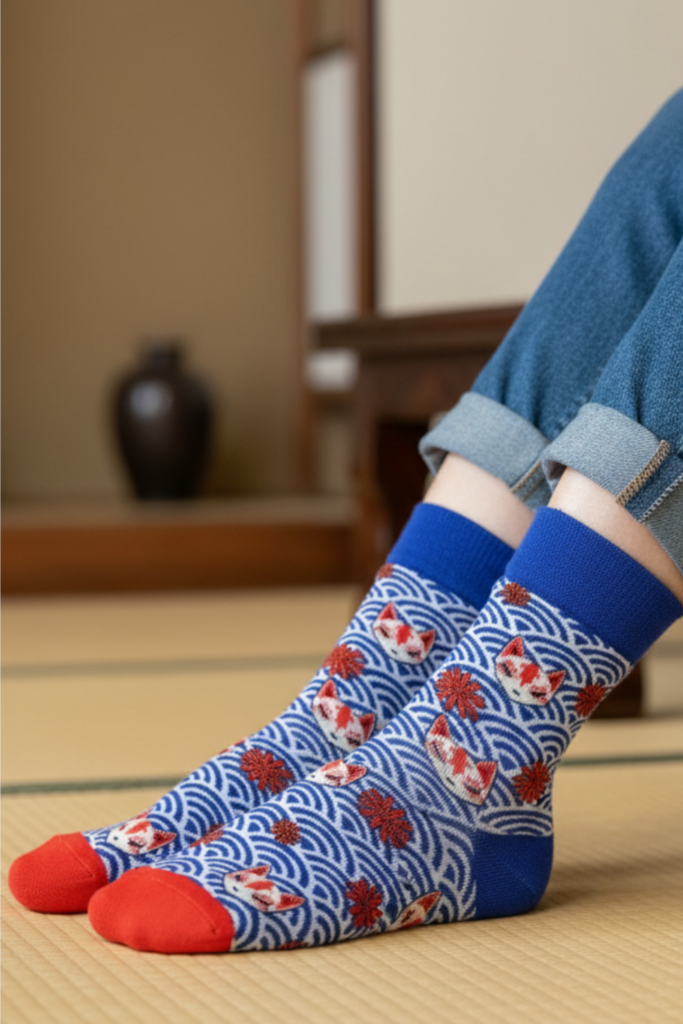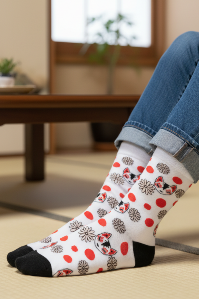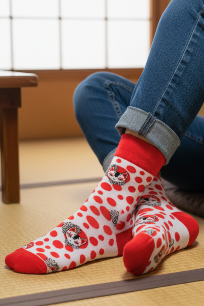 Mia disainis KITSUNE sokid tulepunastes toonides, mis sümboliseerivad rebaste sidet tulega Jaapani pärimuses.